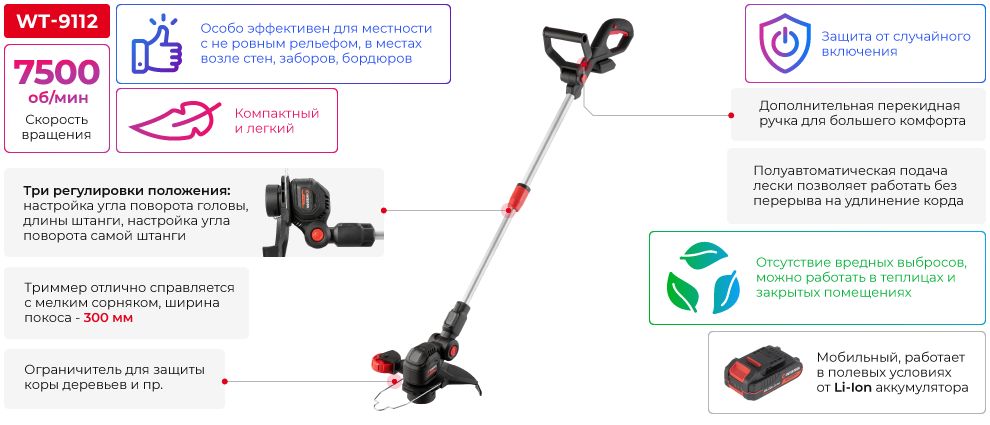 Тример має невелику вагу та компактні габарити. Не прив'язаний до електромережі та може працювати в польових умовах, оранжереях, теплицях тощо.
