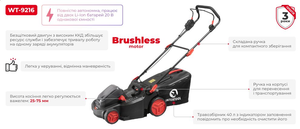 Газонокосарка акумуляторна INTERTOOL WT-9216 (2х20В, 3500об/хв без ЗП та АКБ)