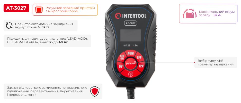 Зарядний пристрій INTERTOOL AT-3027 — керується мікропроцесором і системою з багатоступеневим циклом заряджання. Пристрій підходить для всіх типів батарей: 6 В мотоциклів, 12 В автомобілів, а також для акумуляторів катерів, газонокосарок, гідроциклів, сільськогосподарської техніки, промислового та побутового обладнання.